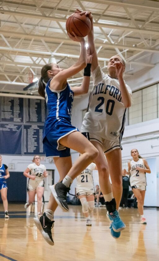 Milford's Avery Fuller blocks a shot by Hollis Brookline's Julia Robbins during Tuesday night's game in Milford. (Courtesy photo)