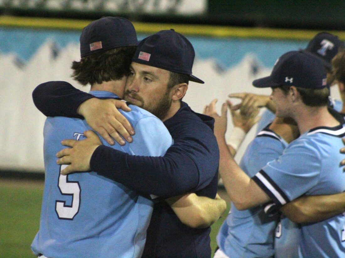 North baseball coach Zach Harris hugs freshman reliever Nolan Sullivan after the Titans fell 5-4 in nine innings to Pinkerton Wednesday night in the Division I semifinals at Holman Stadium. (Telegraph photo by TOM KING)