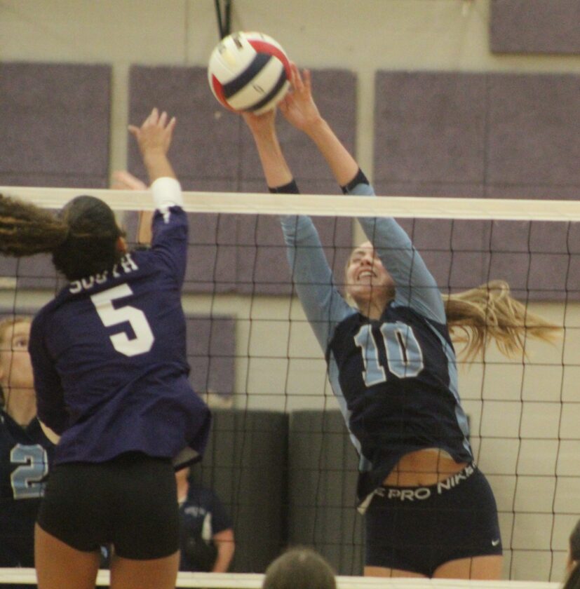 Nashua North's Hayley Maurhoff (10) goes up for the block of a hit by Nashua South's Hannah Perez will be in the Divisio I tourney with their respective teams this week. (Telegraph file photo by TOM KING)