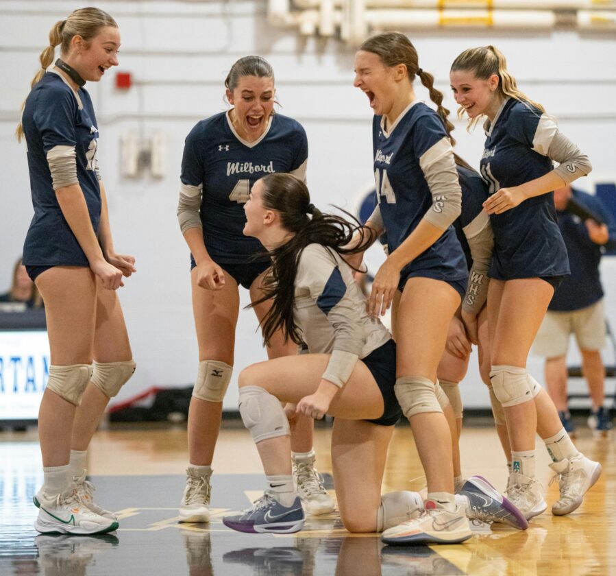Milford girls volleyball players celebrate a point during their Division II quarterfinal win over Laconia on Friday night in Milford. (Courtesy photo)