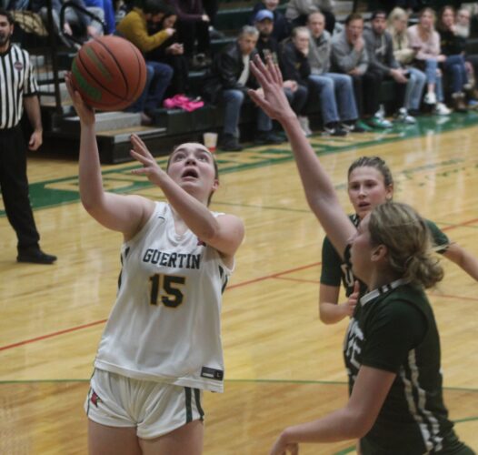 Bishop Guertin's Holly Dufoe goes up for a layup ahead of Dover's Violet Burt during Friday night's Division I game at the Colligadome. (Telegraph photo by TOM KING)