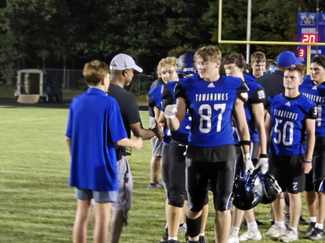 Merrimack Senior TE/DL Zach Retey (87) leads the line to shake hands with the coaching staff, a tradition under Tomahawks head coach Kip Jackson, after Friday’s season opener vs. Bedford. (Photo by Dan Attori)