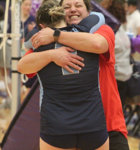 Nashua North girls volleyball coach Cassandra Desfosses hugs her Titan daughter Johanna after North beat South 3-2 in the 2024 Battle of the Bridge at the Belanger Gym. (Telegraph file photo by TOM KING)