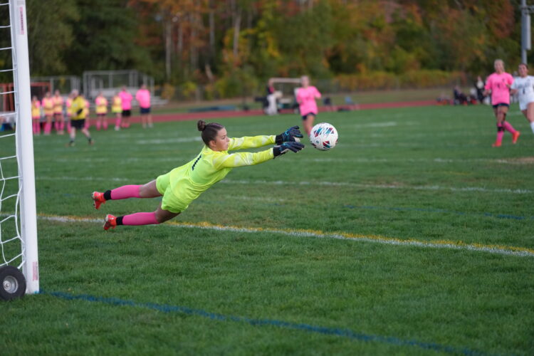Delaney Barber kept Milford in their game with Hollis Brookline for the first half with saves like this. (Courtesy photo by Betsy Hansen)