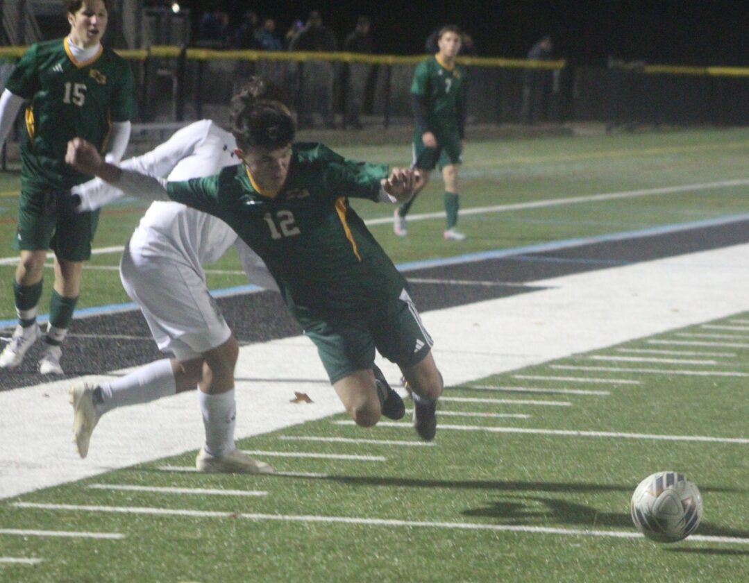 Bishop Guertin's Ryan Neary leaps in the race to the ball while covered by Nashua North's Josh Alvarez during Thursday night's Division I game between city rivals at Stellos Stadium. (Telegraph photo by TOM KING)