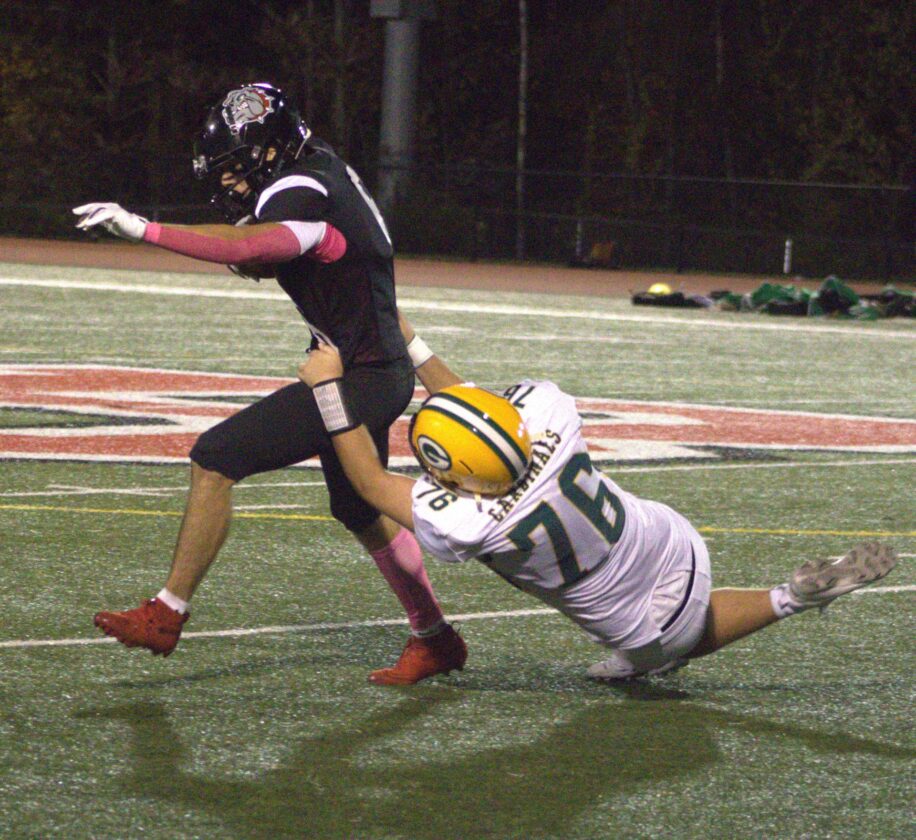 Bishop Guertin's Max Moynihan wraps up Bedford's Brycen D'Urso during the third quarter of Bedford's 35-28 win on Friday. (Photo by Dan Doyon)