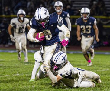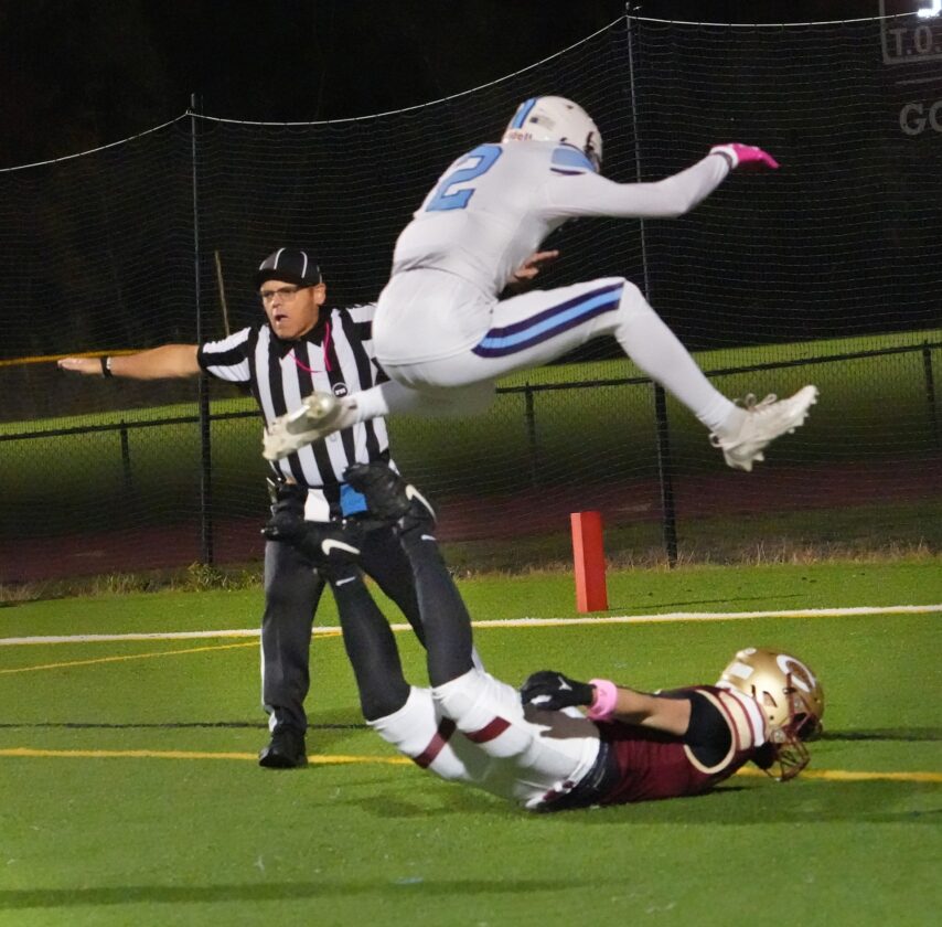 Portsmouth-Oyster River's Kevin White misses a pass as Nashua North's Josh Sullivan jumps over him during Friday night's Division I clash in Portsmouth. (Photo courtesy of Seacoast Media Group)