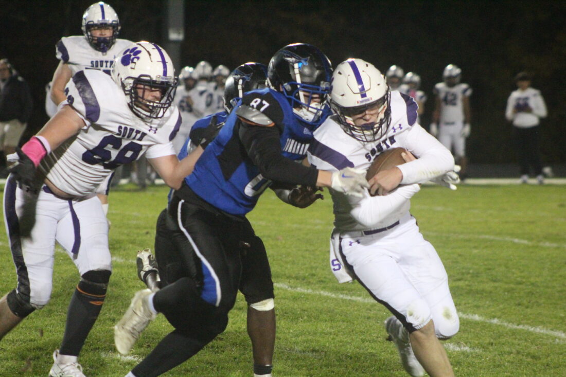 Nashua South's Cody Jackson makes sure to protect the ball while trying to evade Merrimack's Zach Retey (87) during last year's contest in Merrimack. The two teams are back at Student Memorial Field tonight. (Telegraph file photo by TOM KING)