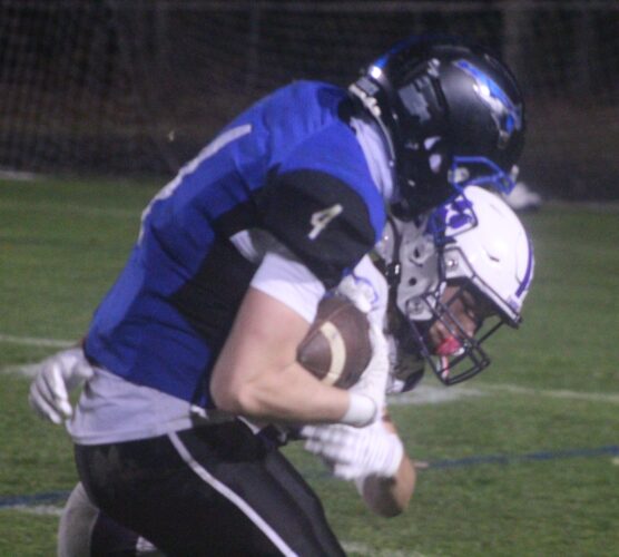 Nashua jumped out to a 21-0 lead with a Jackson first quarter 14-yard TD flip to Colvin Levesque, a Baker 2-yard run and Fish 67-yard catch and run in the second quarter. The Tomahawks got on the board with a Maverick Torres 10-yard TD pass to Cayden Dine, plus a two-point pass to Zach Retey with 1:37 left in the half.