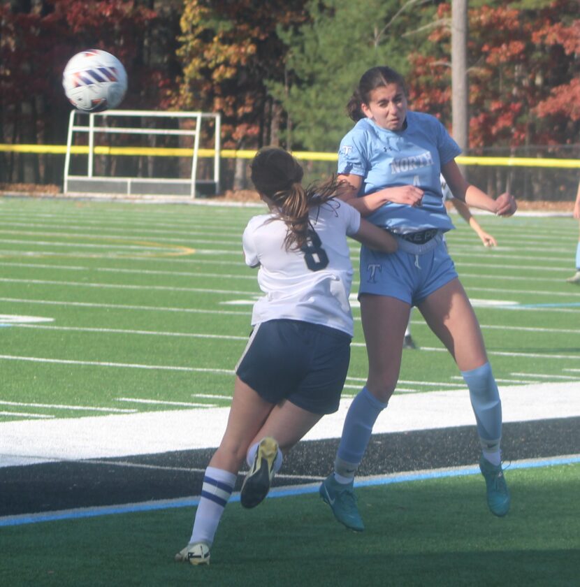 Nashua North's Kathryn Azevedo (4) heads the ball away from Windham's Kylie Candon duirng the first half of Tuesday's Division I preliminary round game at Stellos Stadium. (Telegraph photo by TOM KING)