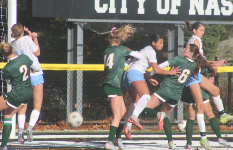 Nashua North goalkeeper Kathleen Schreiner gives it a valiant effort but BG’s Emerson Brown’s shot was out of reach for a first half goal duirng Friday’s Division I quarterfinal at Stellos Stadium. (Telegraph photo by TOM KING)