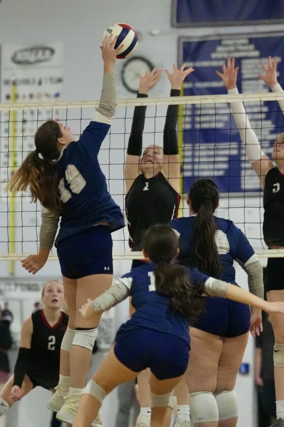 Milford's Skyla Salemi (19) goes up for a hit against Hanover's Claire Starotsa (1) during Saturday's Division II quarterfinals in Milforad. (Courtesy photo by Betsy Hansen)