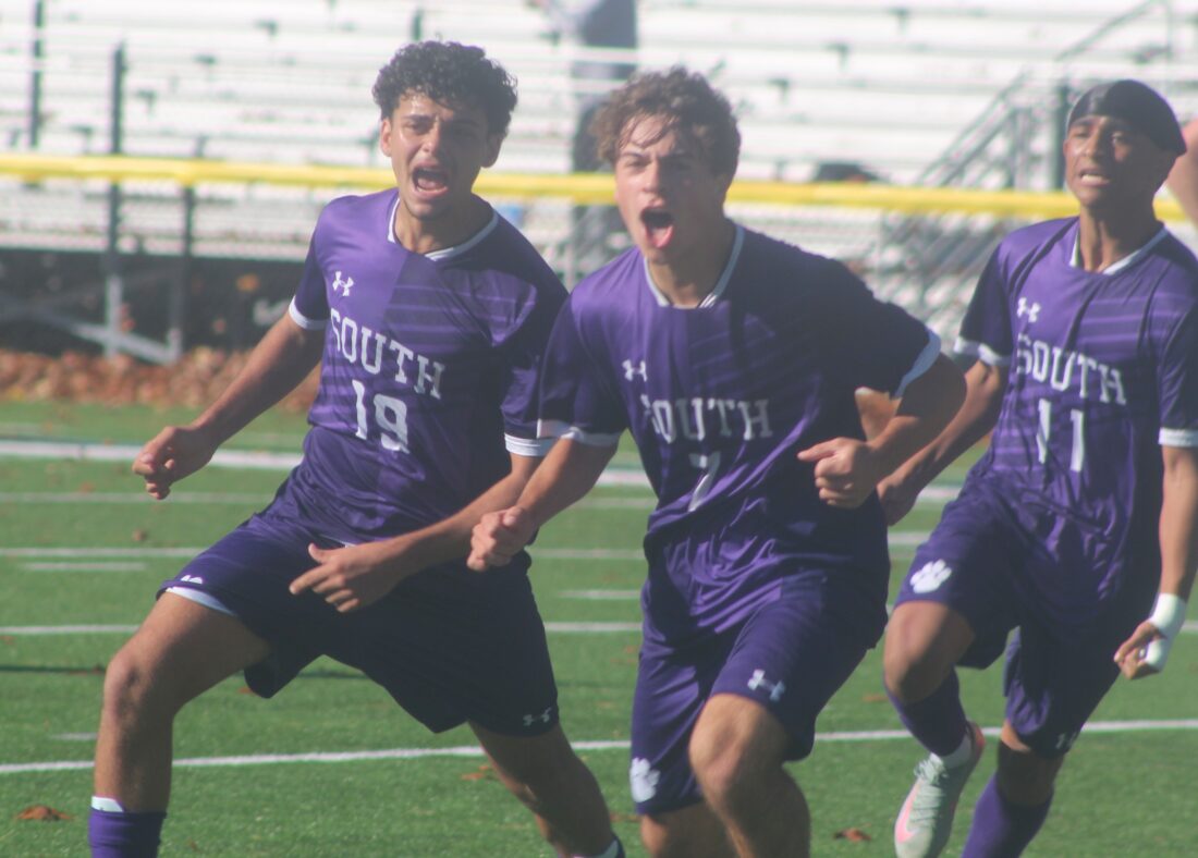 Nashua South's Kevin Arajuo, center, celebrates with teammates Vitor Da Sila Pegas (19) and Damien Rodrigues after scoring a goal in Saturday's Division I quarterfinal win over Exeter at Stellos Stadium. (Telegraph photo by TOM KING)