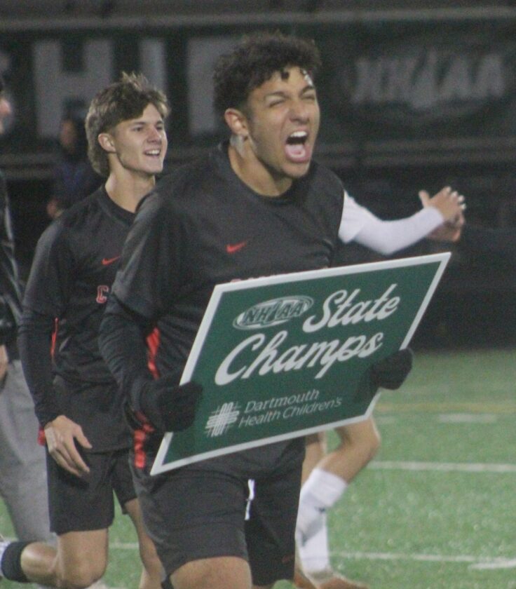 Campbell's Jeremy Rafuse Jr. leads the celebration after the Cougars' 1-0 Division II boys soccer title win over ConVal at Exeter on Friday night. (Telegraph photo by TOM KING)