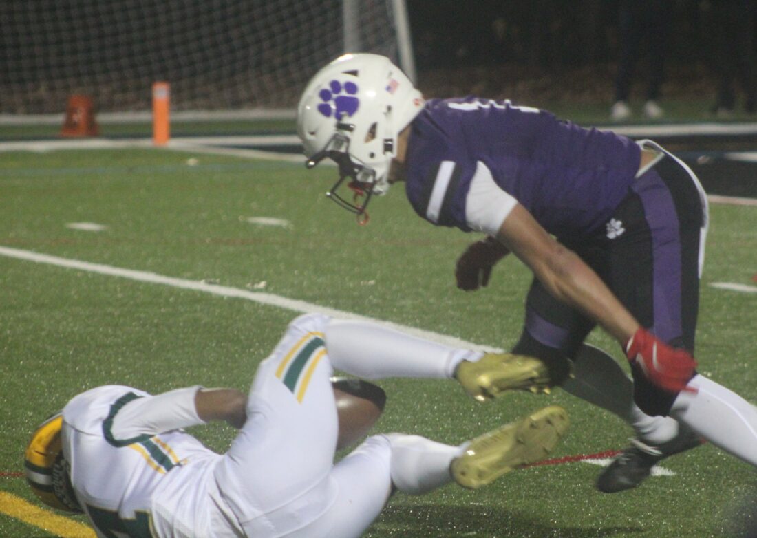 Nashua South's Justin Fish, right, was there if BG's Rocco Roy could have hung on to the football during Friday night's Division I quarterfinal at Stellos Stadium. (Telgraph photo by TOM KING)
