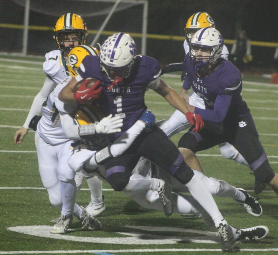 Nashua South's Justin Fish (1) tries to escape a tackle duirng Friday night's Division I semifinal win over Bishop Guertin at Stellos Stadium. (Telegraph photo by TOM KING)