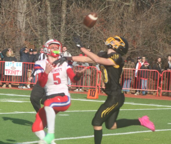 Souhegan’s Brody Smith can’t reach a pass that falls into the arms of Trinity safety Ollie Service (5), a key play in Saturday’s Division II title game in Derry. (Telegraph photo by TOM KING)