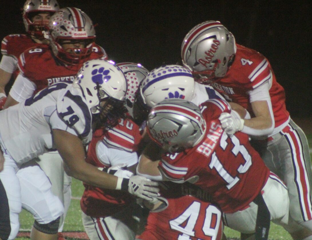 Pinkerton's Jimmy Knudsen (4) and Bentley Blais (13) try to help out Joseph Osanya (10) who is tackled by Nashua South's Kayden Doubleday (79) during a game last month. The Astros come to Nashua today to play in the state title game vs. Bedford at Stellos Stadium. (Telegraph photo by TOM KING)