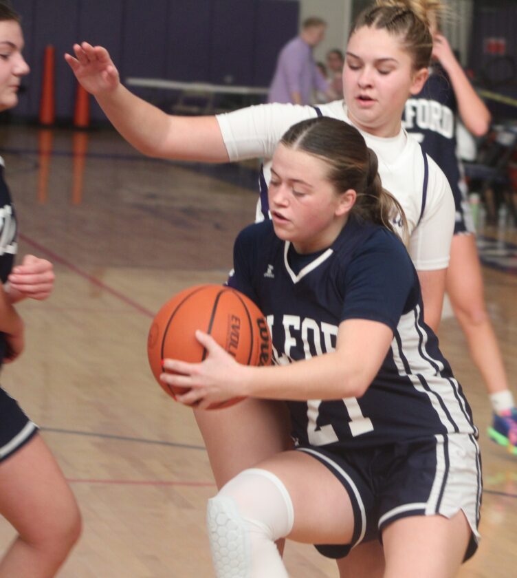 Milford's Shea Hansen drives on Nashua South's Brooke Berger during last year's Nashua Holiday Basketball Tourney. Both players' teams will take part in a big day of preseason basketball Saturday wth the annual Nashua Jamboree at both North and South gyms.(Telegraph file photo by TOM KING)