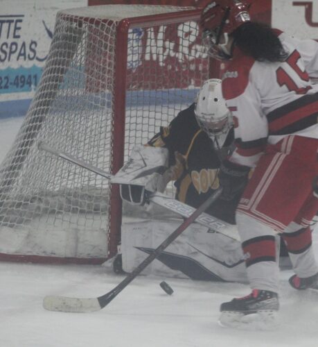 Souhegan-Nashua Storm goalie Charlotte Dezotell makes one of her 84 saves on Pinkerton’s Carmita L’Abbe (15) during Saturday’s season opener at Delta Dental Arena in Hooksett. (Telegraph photo by TOM KING)