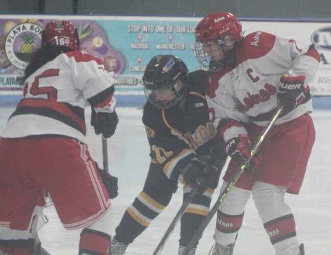 The team is split down the middle between Souhegan and Nashua student-athletes, and there is almost half that had not played organized hockey before, or even the sport entirely. It showed in the second period during which the celebration of the program’s first goal ever by Sophia Wine assisted by Briley Landsteiner at 1:32 of the second period, shorthanded, was short-lived.The Astros, after a scoreless first period, responded with seven unanswered goals.