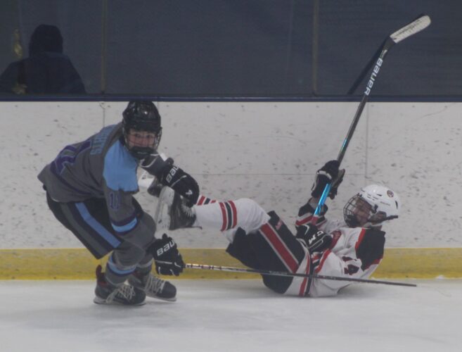 The hosts took the lead 3:29 into the second on a goal by Conor Bythrow, but Nashua tied it 19 second later on a Cullity goal assisted by Doughty six minutes in, and went ahead on a rebound goal by Jared Gauthier, assisted by Brendan Skelley and Braedyn Thyne. Langienese tied it at 3 at 9:46 of the second (Bythrow assist) as a hard shot deflected in off Venezia’s glove.