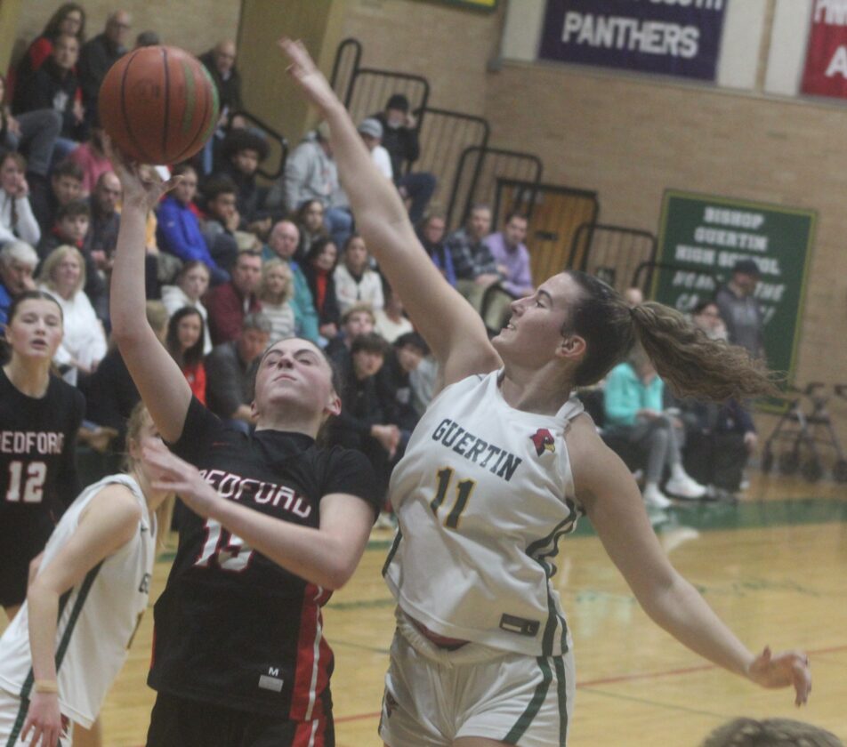 Bishop Guertin's Thalia Drapeau (11) tries to block a shot by Bedford's Julia Laws during Frday night's game at the Colligadome. (Telegraph photo by TOM KING)
