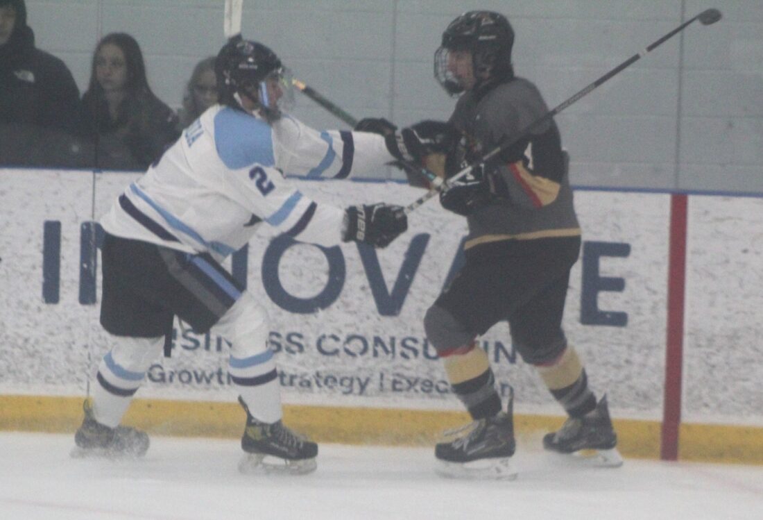 Nashua's Gavin Asimakopulos, left, jousts with Manchester's Ty Adams during Saturday's game at Conway Arena. (Telegraph photo by TOM KING)
