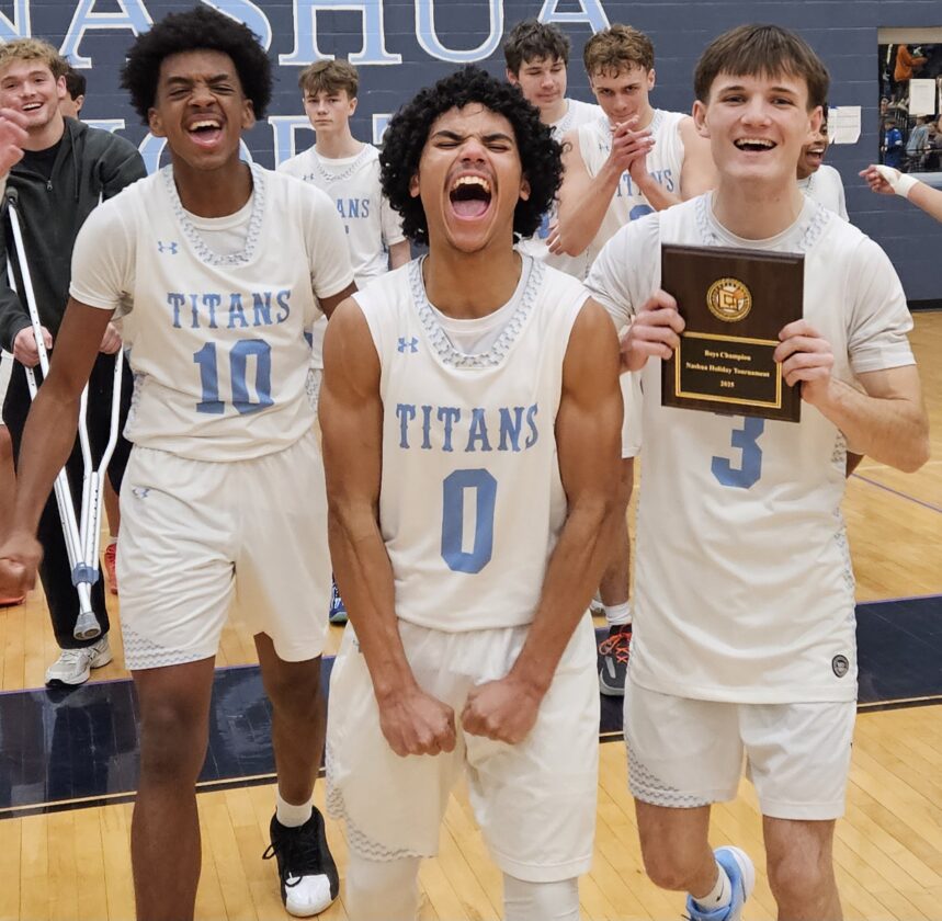 Nashua North's Sean Battle (10), Tyson Hoang (0) and Evan Linscott lead the celebration after the Titans edged rival Nashua South 73-72 to win their second straight Nashua Holiday Basketball Tourney championship Sunday at North. (Telegraph photo by TOM KING)