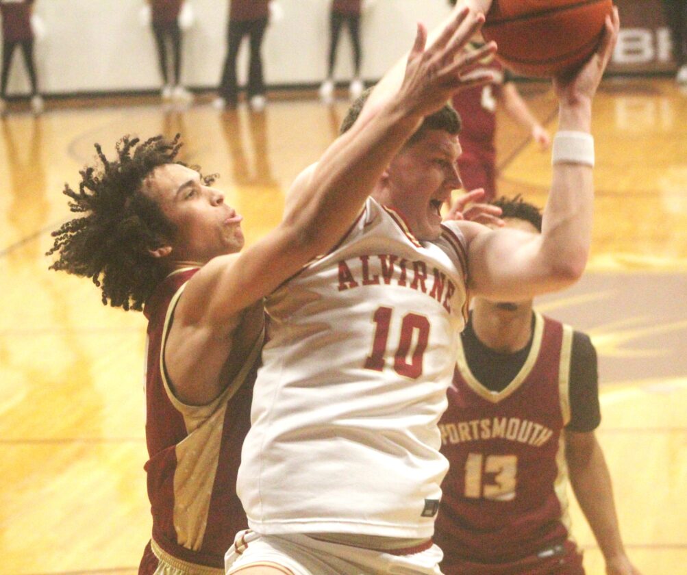 Alviren's Garrett Hall (10) grabs a rebound while pressured by Portsmouth's Cote Bellaud duirng Friday night's Division I clash in Hudson. (Telegraph photo by TOM KING)