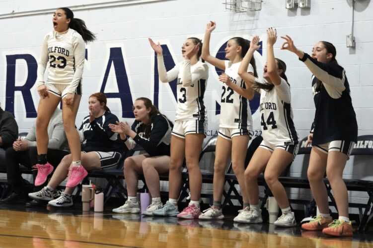 The Souhegan girls hoop bench with head coach Greg Cotreau reacrt to a big play in Tuesday night's game against rival Milford. (Courtesy photo by Betsy Hansen)