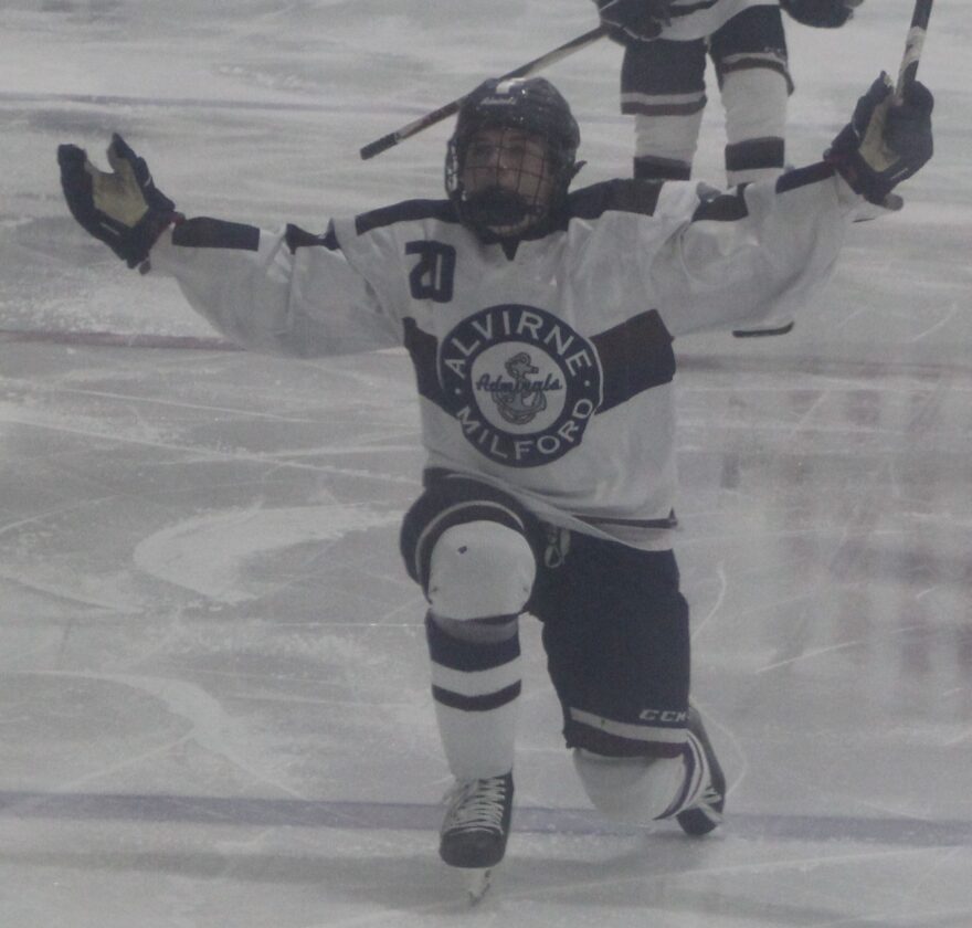 Alvirne-Milford's Dylan MacLeod celebrates his key goal in the Admirals' win over the MHBDS WarHawks Wednesday night at Skate 3 in Tyngsborough, Mass. (Telegraph photo by TOM KING)