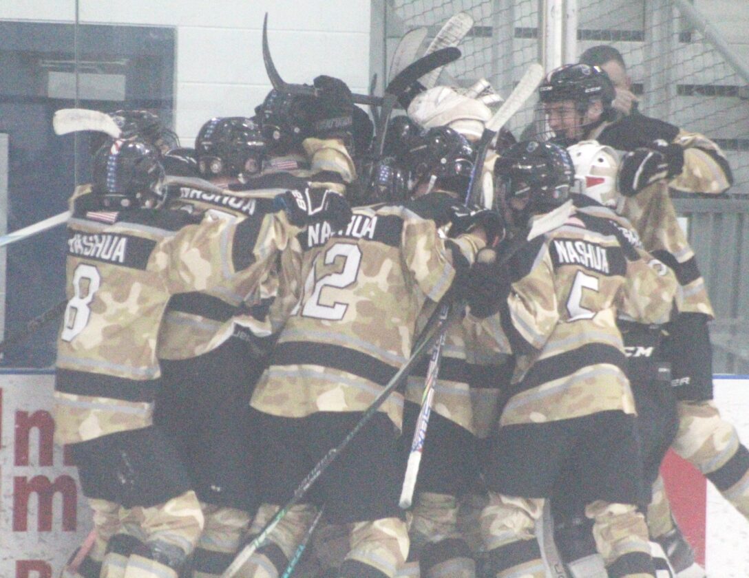 The Nashua Knights celebrate their dramatic last-second comeback win over MHBDS on Saturday at Conway Arena, the new program's first official win. (Telegraph photo by TOM KING)