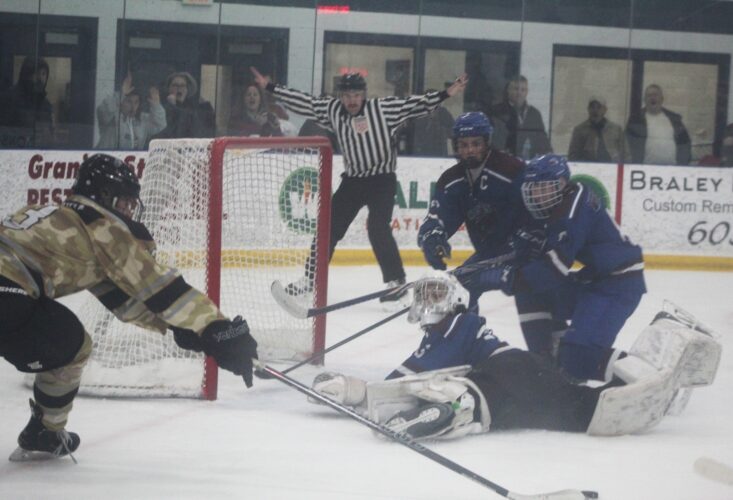Nashua North-South’s Gavin Asimakopulos pounced on a loose puck after Merrimack-Hollis Brookline-Derryfeld’s goalie Liam Gagne made a save on the Knights’ Thomas Dratch and banged it home with a scant three-tenths of a second left. That gave the Knights their first win a month into the season, 6-5 at Conway Areana on Military Appreciation Day.