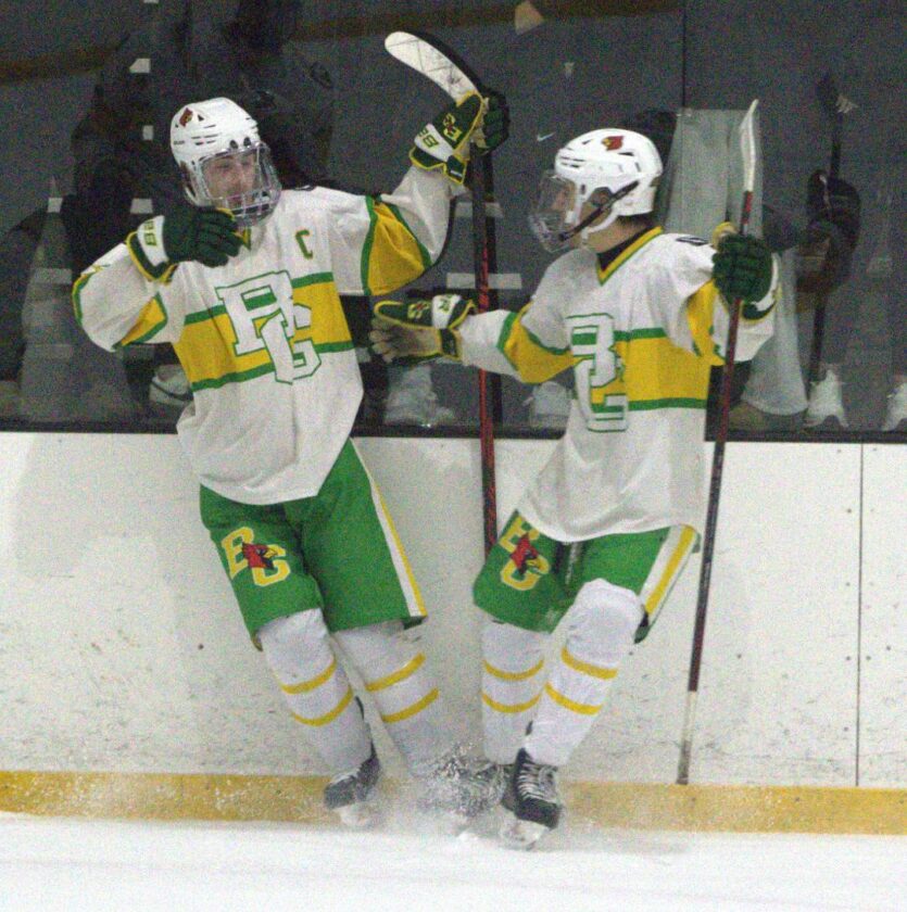 Bishop Guertin's Jordan O'Hearn (left) is congratulated by Cam Vaillancourt following O'Hearn's go-ahead goal in the second period of Wednesday's 4-2 win over Concord. (Photo by Dan Doyon)
