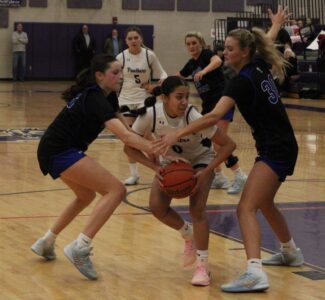 Nicole De Jesus (0) is double teamed by Concord Christian's Brynn Vaillant (left) and Emma Smith (right) in the second half of Thursday's 56-42 South loss. (Photo by Dan Attorri)