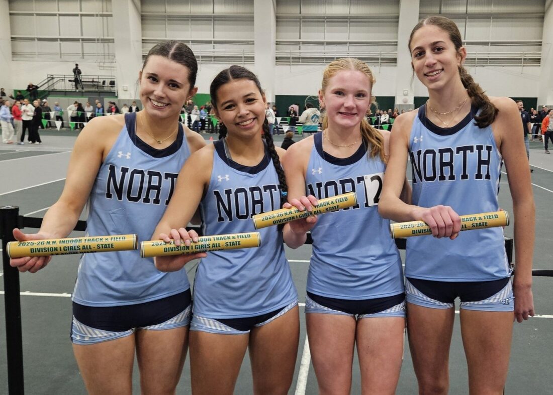 The Nashua North 4x400 relay team of, in no particular order, Charlotte Wilson, Allie Frye, Rosie Neveu and Abigail Azevedo captired the state tite on Sunday at Plymouth State. (Courtesy photo)