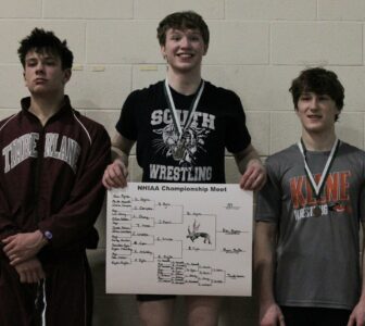 Nashua South's Ben Byrne stands at the top of the podium after winning the 157-pound title at the NHIAA Division I wrestling championship Sunday in Londonderry. (Photo by Dan Attorri).