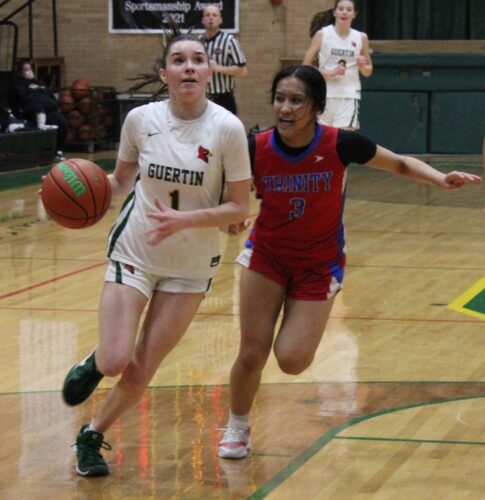 The game was tied heading into the fourth quarter, but senior forward Thalia Drapeau scored eight of her team-high 14 points in the final frame to lead No. 8 Bishop Guertin (12-7) to a 44-40 victory over No. 9 Trinity (11-8) at the Colligadome.