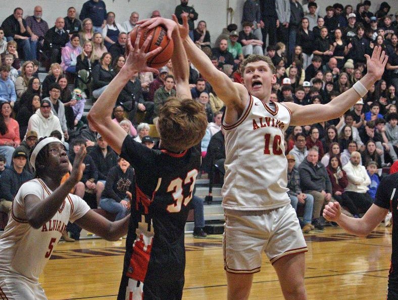Alvirne's Garrett Hall blocks a shot attempt by Keene's Rhys Fontaine during Wednesday night's Division I prelim in Hudson. (Photo by Michael McMahon/Keene Sentinel)