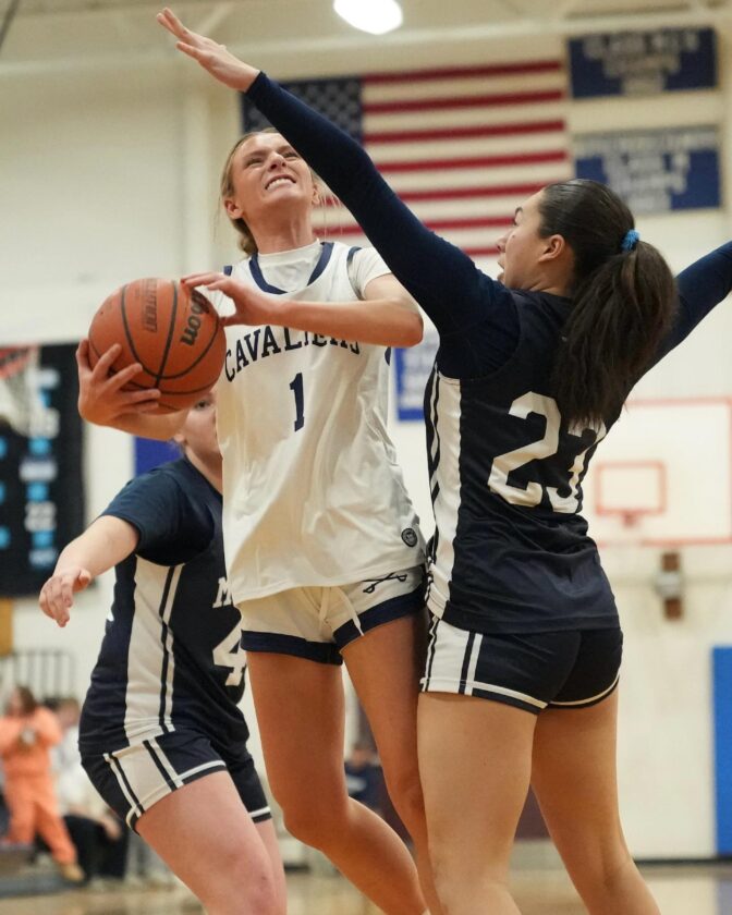 Hollis Brookline's Ana O'Donnelll fights her way to the hoop against Milford's Trinity Millner (23) during Wednesday night's Division II prelim in Hollis. (Courtesy photo by Betsy Hansen)