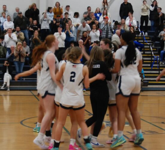 The Hollis Brookline girls basketball players and their fans celebrate Wednesday night’s Divison II prelim round win over Milford (Photo by Jack Belanger)