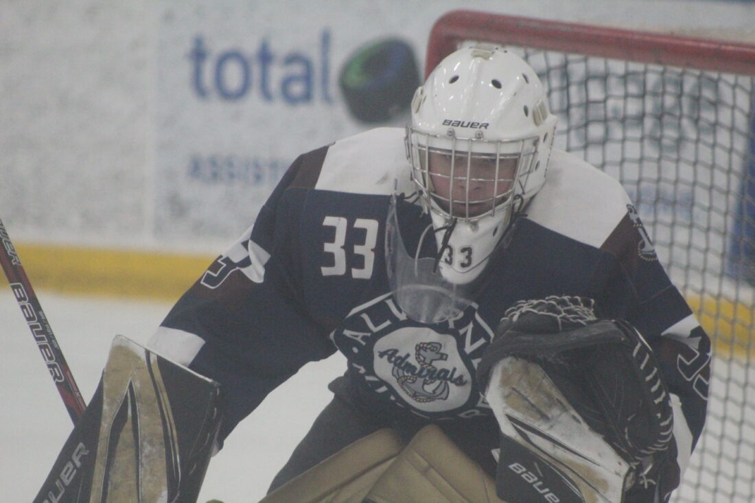 Kian Corcoran's play in goal is one of the big reasons the Alvirne-Milford boys hockey team goes into the Division II tourney as the No. 1 seed. (Telegraph photo by TOM KING)