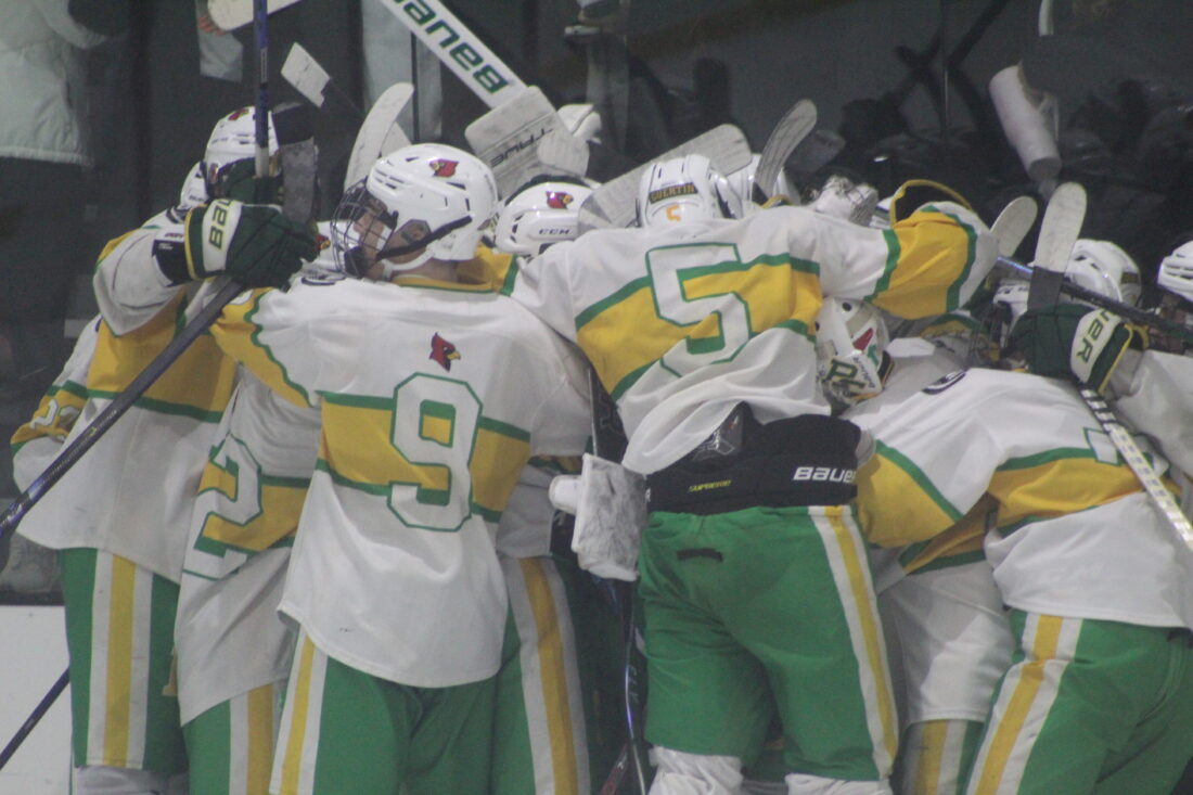The Bishop Guertin boys hockey team celebrates its 4-1 win over Keene in Saturday's Division I quarterfinal at Skate 3 in Tyngsborough, Mass. (Telegraph photo by TOM KING)
