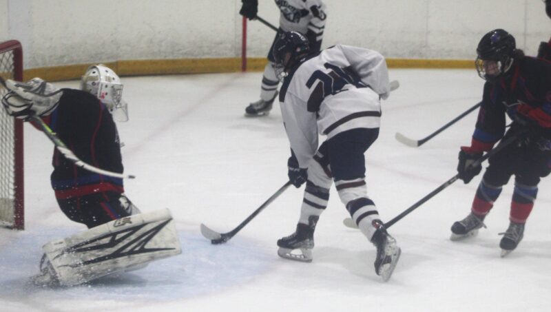 Alvirne-Milford’s Chris Bozza tries to put a backhander on Somersworth-Coe-Brown goalie Colby Strum during Saturday’s Divison II quarterfinal at Skate 3. (Telegraph photo by TOM KING)
