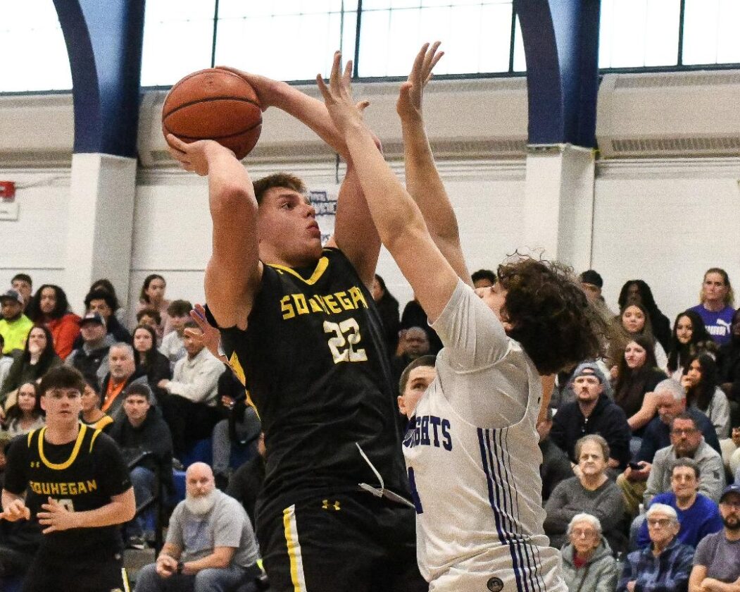 Souhegan's Jon Busha pulls up for a shot over Manchester West's Ayden Ramirez during Saturday's Division II boys basketball quarterfinal. in Manchester. (Photo by Joe Marchilena/NHHighSchoolSports.com.)