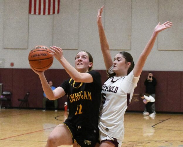 ouhegan’s Zofia Rosenfield puts up a shot as Derryfield’s Emma Sloper defends during Saturday’s Division II girls basketball quarterfinal in Manchester. (Photo by Joe Marchilena/NH-HSSports.com)