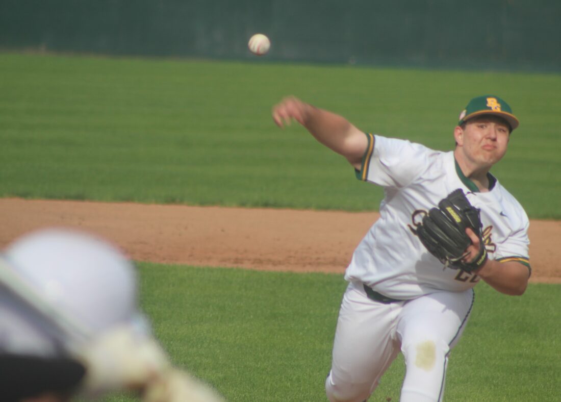 Bishop Guertin's Ben Geiger delivers on of the 74 pitches he threw in a complete game shutout of Nashua South on Monday at Holman Stadium. (AP photo)