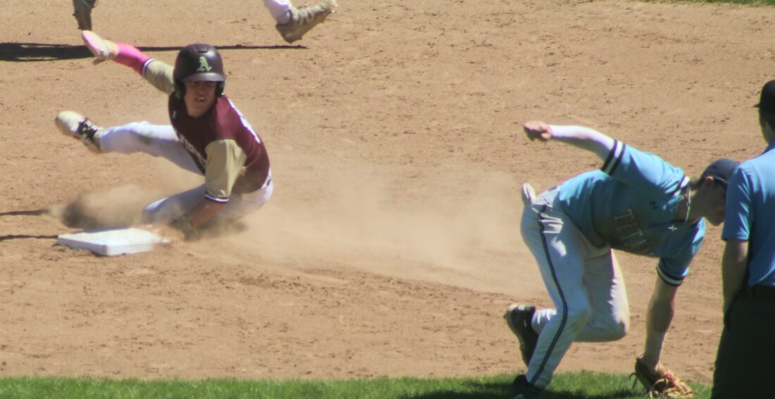 Alvirne's Matt Bebris looks back while North infielder Dawson Bolton reaches for the ball during Monday's Division I clash at Holman Stadium. (Telegraph photo by TOM KING)