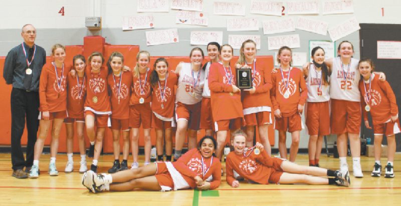 Amherst Middle School Girls basketball concluded their season by defeating Timberlane 47-23 to win the D 6 championship and remain undefeated, 14-0. The team was led by Kayden Merriam’s 18 points, many off of Ori Dart assists who also added 12 points and led the defensive charge.